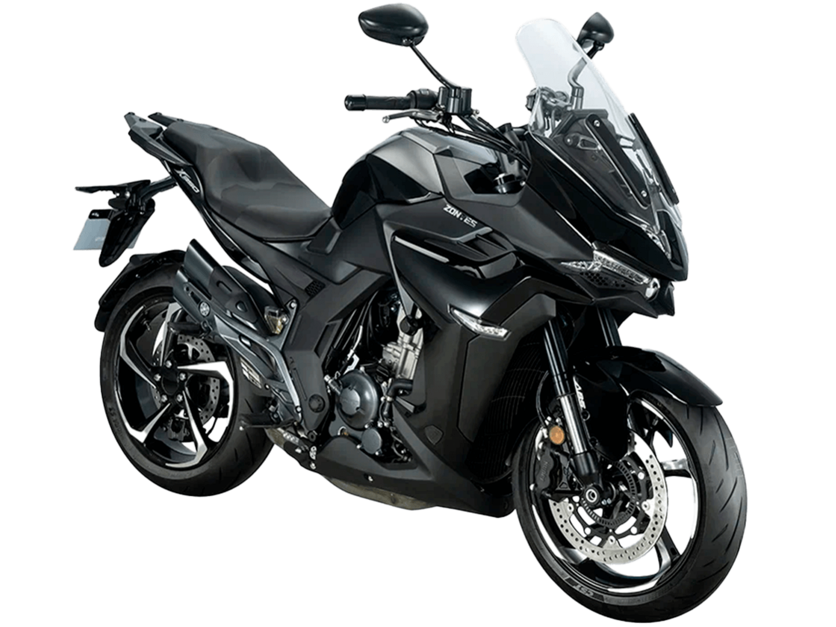 Мотоцикл ZONTES ZT350-X1 – турист со стремительным современным дизайном. Хорошо подходит как для повседневных поездок по городу, так и для покорения дальних маршрутов.Силовая установка представлена одноцилиндровым 4-тактным двигателем ZT184MP с 4 клапанами и 2 верхними распредвалами. Двигатель имеет объём 348 см³ и обеспечивает мощность в 39 л.с. Оснащён инжектором BOSCH и системой жидкостного охлаждения. Механическая коробка передач имеет 6 ступеней и схему 1-N-2-3-4-5-6. Запуск двигателя осуществляется с помощью бесключевого доступа.Ёмкость топливного бака 19 литров.Колёса представлены литыми алюминиевыми дисками диаметром 17 дюймов. На мотоцикл установлены датчики давления в шинах, показатели от которых выводятся на приборную панель. Для подвески спереди используется телескопическая вилка, сзади – моноамортизатор. Гидравлические дисковые тормоза произведены испанской компанией J.JUAN, входящей в холдинг BREMBO.Для освещения используется яркая LED-оптика, а приборная панель представлена цифровым дисплеем. Рычаги тормоза, сцепления и лапки КПП можно отрегулировать. Имеется 2 USB-порта.Габариты мотоцикла 2055х795х1330 мм. Колёсная база 1395 мм. Высота по седлу 795 мм. Вес 169 кг.