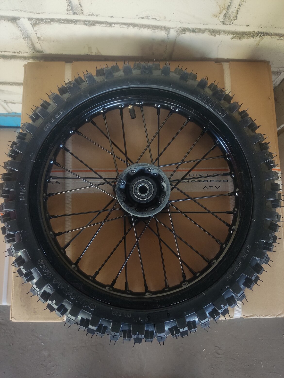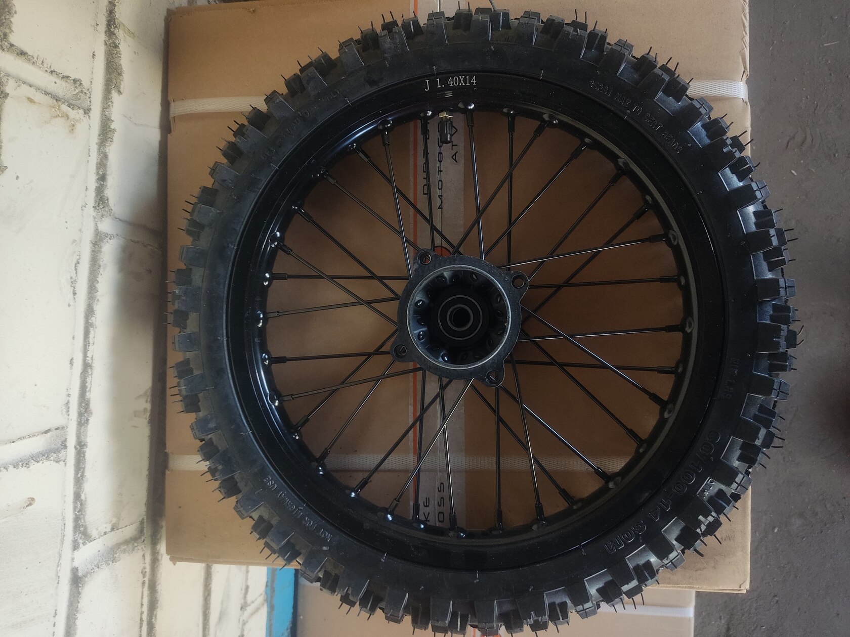 • Переднее колесо в полной комплектации с покрышкой. Алюминиевый обод черного цвета диаметром 14 дюймов. Посадочный диаметр под ось 15 мм. Поставляется без тормозного диска и без оси в комплекте.