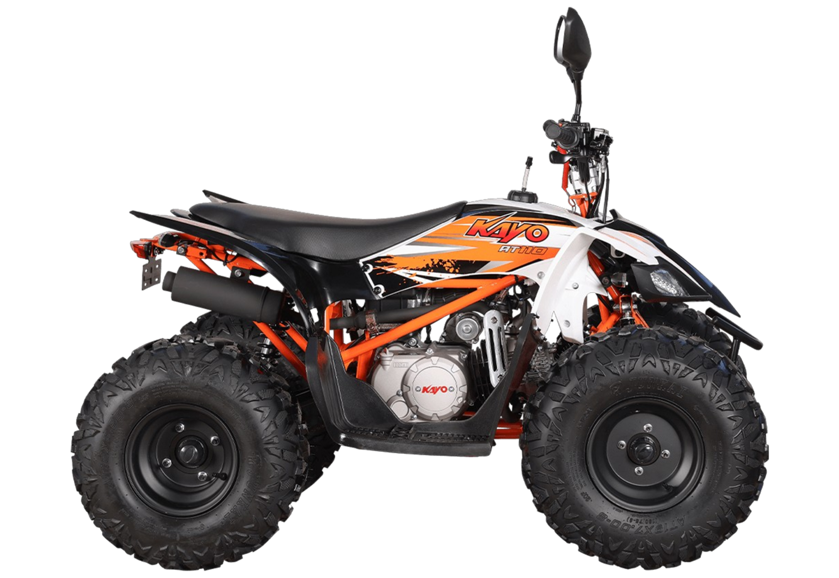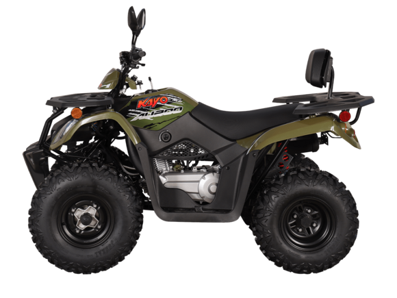Квадрицикл KAYO AT110 – выносливая модель для освоения спортивной езды по бездорожью или помощи в хозяйстве. Хорошо подходит для детей и подростков, интересующихся поездками за пределами проторенных троп.Одноцилиндровый 4-тактный двигатель YX1P53FMH-2 с верхним распредвалом и воздушным охлаждением имеет объём 107 см3. Максимальная мощность 7,2 л.с. За подачу топлива отвечает карбюратор. Привод осуществляется на 2 колеса. Трансмиссия имеет автоматическую коробку передач со схемой F-N-R.Запуск осуществляется с помощью системы электронного зажигания. Имеется функция родительского дистанционного выключения двигателя.На квадрицикле используются колёса диаметром 8 дюймов. Амортизаторы подвески имеют длину 265 мм, задние можно регулировать. За торможение отвечает гидравлическая дисковая система. Клиренс составляет 110 мм, колёсная база 920 мм.Габариты модели 1360х840х880 мм, высота по седлу 660 мм, вес 98 кг. Ёмкость бака 4 литра.Наличие ПТС позволяет зарегистрировать технику на дорогах общего пользования.
