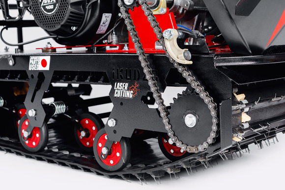 • 12. Мотобуксировщики IKUDZO имеют идеальную балансировку и нагрузку на гусеницу. Двигатель размещён так, что даже без дополнительного груза на мотособаке давление на снег будет равномерно, что значительно повышает проходимость!
