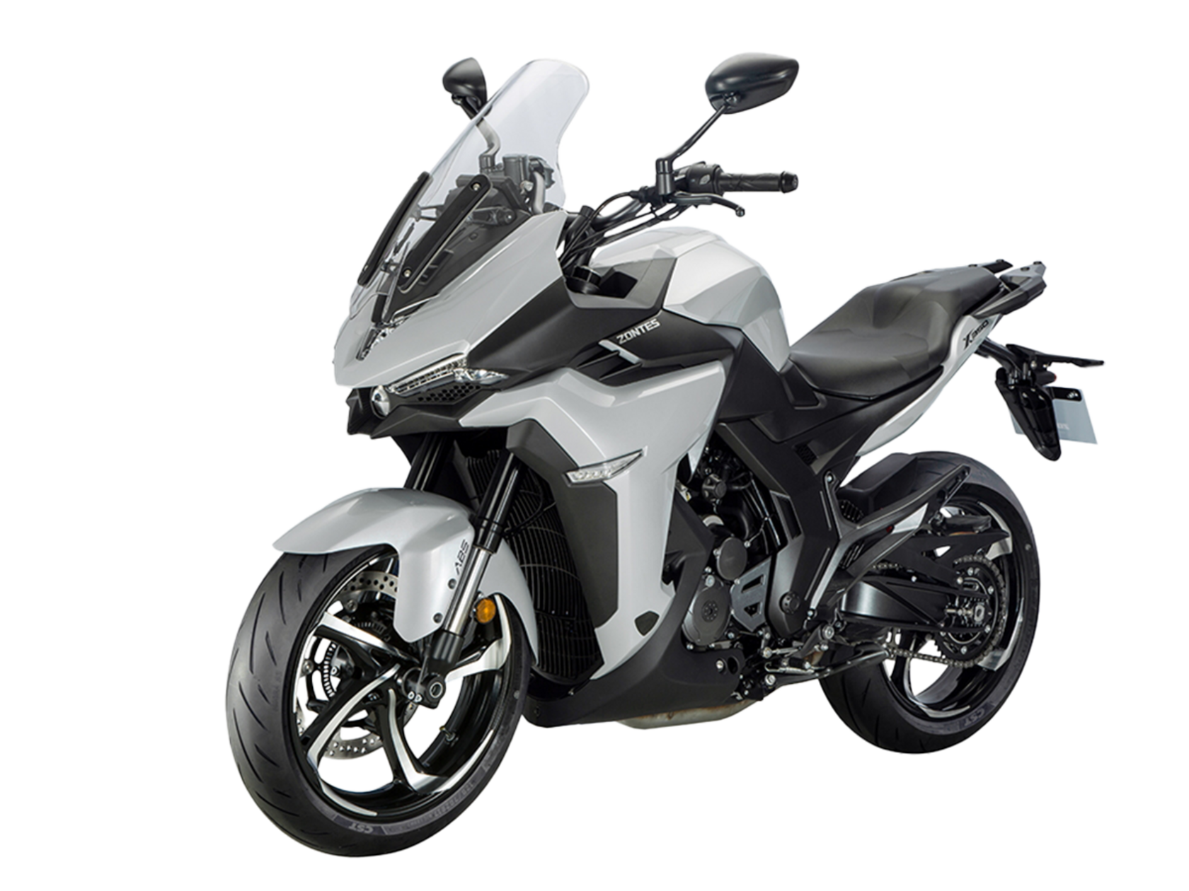 Мотоцикл ZONTES ZT350-X – турист со стремительным современным дизайном. Хорошо подходит как для повседневных поездок по городу, так и для покорения дальних маршрутов.Силовая установка представлена одноцилиндровым 4-тактным двигателем ZT184MP с 4 клапанами и 2 верхними распредвалами. Двигатель имеет объём 348 см³ и обеспечивает мощность в 39 л.с. Оснащён инжектором BOSCH и системой жидкостного охлаждения. Механическая коробка передач имеет 6 ступеней и схему 1-N-2-3-4-5-6. Запуск двигателя осуществляется с помощью бесключевого доступа.Ёмкость топливного бака 19 литров.Колёса представлены литыми алюминиевыми дисками диаметром 17 дюймов. На мотоцикл установлены датчики давления в шинах, показатели от которых выводятся на приборную панель. Для подвески спереди используется телескопическая вилка, сзади – моноамортизатор. Гидравлические дисковые тормоза произведены испанской компанией J.JUAN, входящей в холдинг BREMBO.Для освещения используется яркая LED-оптика, а приборная панель представлена цифровым дисплеем. Имеется 2 USB-порта.Габариты мотоцикла 2055х795х1330 мм. Колёсная база 1380 мм. Высота по седлу 795 мм. Вес 169 кг.