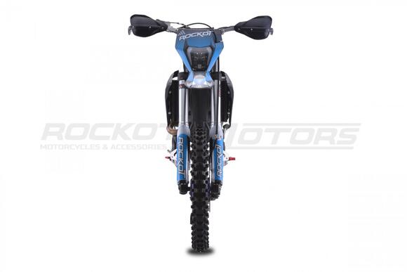 ROCKOT GS 8 RUSH - абсолютная новинка лета 2023 года от компании ROCKOT-MOTORS. Полноразмерный эндуро мотоцикл, с топовой подвеской и совершенно новым мотором, которого ждет не меньший успех, чем “народный” 172-ой.ROCKOT GS 8 RUSH - построен на новой раме S8, в облицовке австрийского GASGAS. Пластик отлит в черном цвете, на который нанесена яркая, контрастная графика в сочетании черного, синего и серого цветов. Расцветка графики эффектно подчеркивает каждую деталь мотоцикла. Рама, траверсы, руль, рычаги тормоза и сцепления, окрашены в черный цвет. В синем цвете выполнены колесные ступицы, CNC крышка бака и защитные наклейки на ободьях колес. Все остальные детали мотоцикла окрашены в серый, металлический цвет.Производительная тормозная система, превосходно останавливает байк на бездорожье даже при резком, экстренном торможении. Превосходный и ощутимый отклик тормозной системы на каждое усилие при нажатии, не позволит Вам допустить ошибку при торможении. Гидролиния переднего и заднего тормоза - армированная. Спереди установлен двухпоршневый тормозной суппорт, сзади - однопоршневый.Задняя тормозная система максимально защищена: задний тормозной цилиндр закрыт пластиковой защитой рамы. Также защищены и задние тормозные суппорт и диск.ROCKOT GS 8 RUSH – полноразмерный эндуро мотоцикл с мощным двигателем воздушно-масляного охлаждения. Данная модель вполне заслуженно является одной из лучших, среди эндуро мотоциклов предназначенных для гонок класса «Lite» и способна привезти новичка на «тумбу победителей»