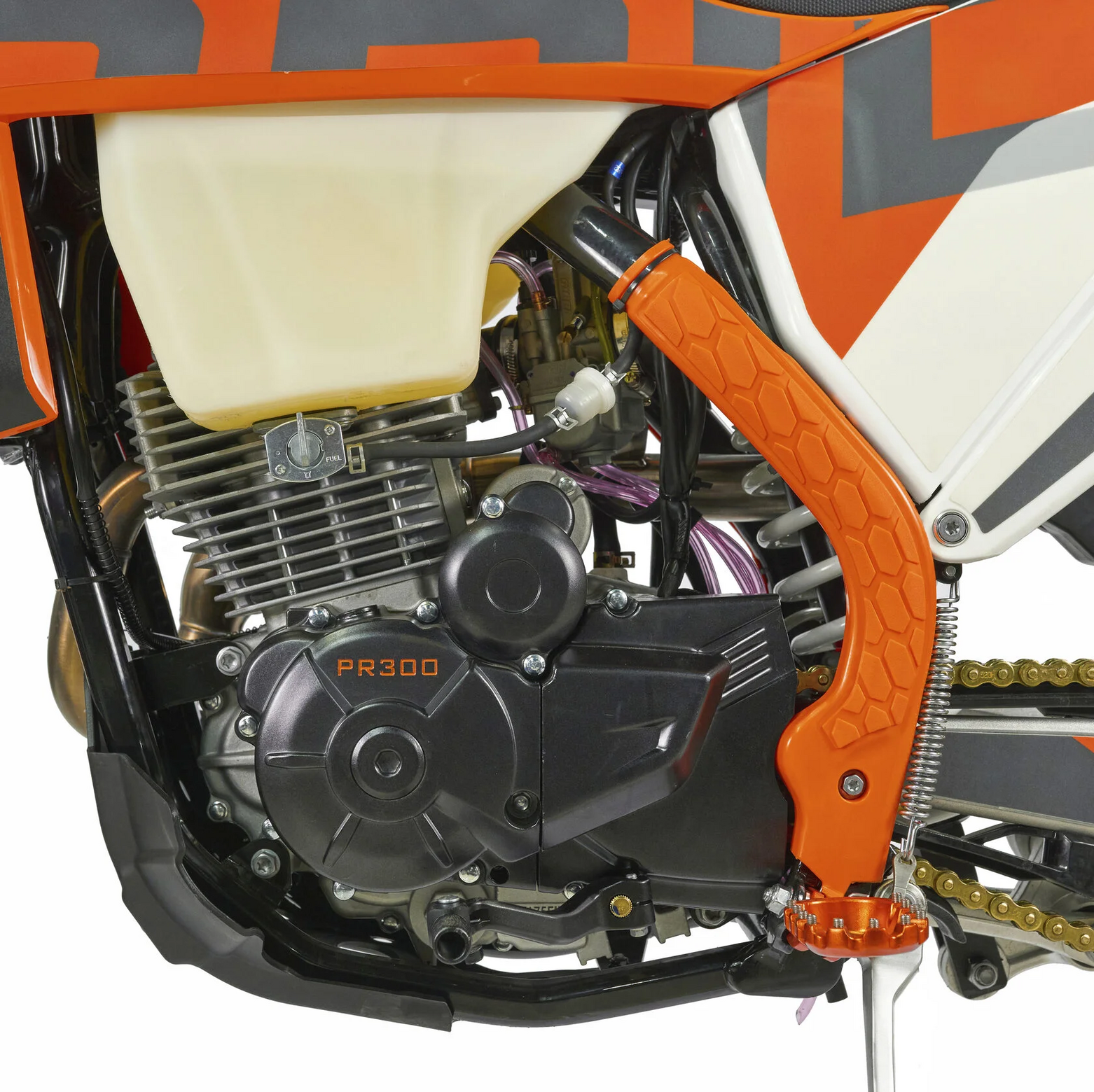 КомплектацияЭлектронная приборная панель, противоскользящее сиденье, защита рамы от протирания ботинками, подножки «AJ1» (алюминий 6063 с шипами), подножка боковая «AJ1» (алюминий 7075-Т6), невозгораемый воздушный фильтр «AJ1» – Twin Air с увеличенной площадью, ведомая звезда «AJ1» (520, алюминий 7075-Т6), защита рук, грипсы OTOM/Lock-On, передние и задние буксаторы «AJ1», откидные алюминиевые рычаги 270, алюминиевая лапка КПП, пульт света КТМ, LED фара 5 линз, моточасы, фрезерованная траверса X trigДвигательМодель оснащена надежнейшим 1-цилиндровым 4-х тактным двигателем ZONGSHEN 175FMN с воздушным охлаждением объёмом 271,4 см3, который выдаёт 25 л.с.ПодвескаПередняя вилка "MNT" перевернутого типа T7 48- 910mm с регулировкой на сжатия и отбой. Моноамортизатор "MNT" также с регулировками. Система прогрессии, обеспечивает равномерную, мягкую работу и увеличивает длину рабочего хода подвески. Также ось крепления маятника совпадает с осью крепления ножки. Это существенно улучшает развесовку мотоцикла.КолесаСпереди и сзади установлены антибуксаторы бренда "AJ1", которые притягивают покрышку к ободу, позволяя ездить по бездорожью при низком давлении в камерах, не давая покрышке проворачиваться во время езды. Размер передней покрышки: 80/100 R21. Размер задней покрышки: 120/90-R18. Модель комплектуется "жирной" резиной "KENDA". Все эти характеристики позволяют мотоциклу отлично себя чувствовать в песке и грязи.Тормозная системаПолностью гидравлическая с армированными шлангами. Спереди и сзади установлен двухпоршневой суппорт. Данная конфигурация тормозных механизмов, позволяет быстро и безопасно оттормаживаться даже в самых непростых условиях.Сухой вес мотоцикла 115кг