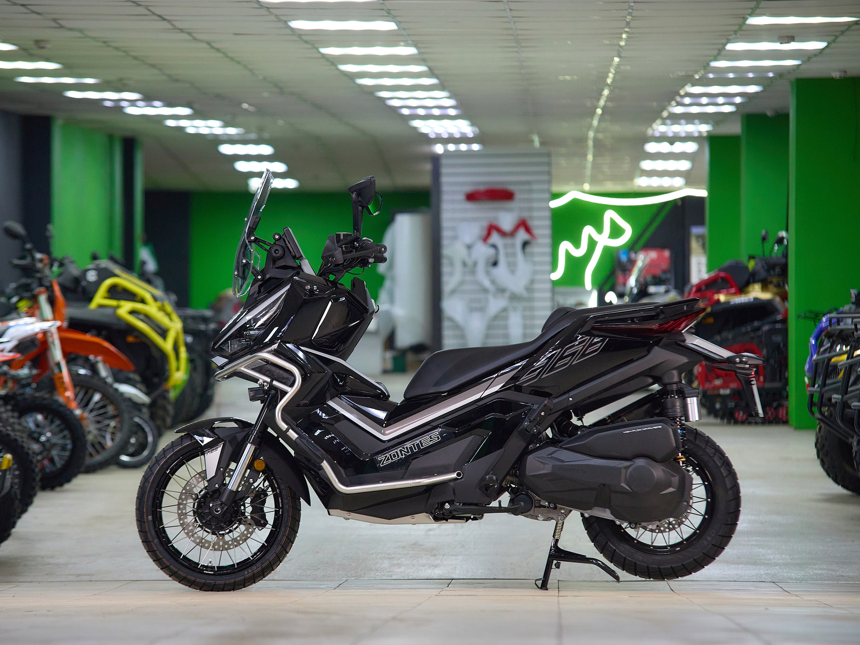 Скутер ZONTES ZT368-G – максискутер двойного назначения, готовый пронестись по улицам города за его пределы и отправиться по грунтовым тропам прокладывать свой маршрут туда, куда вам потребуется. Регулируемая подвеска с перевёрнутой телескопической вилкой спереди обеспечит отличную управляемость и устойчивость в любых условиях.Силовая установка представлена одноцилиндровым 4-тактным двигателем. Двигатель имеет объём 368 см³ и обеспечивает мощность в 38,8 л.с. Оснащён инжектором BOSCH, системой жидкостного охлаждения и вариатором. Запуск двигателя осуществляется с помощью бесключевого доступа.Ёмкость топливного бака 17,5 литра.Колёса имеют диаметр 17 дюймов спереди и 14 дюймов сзади. Для подвески спереди используется телескопическая вилка перевёрнутого типа, а сзади установлены 2 гидравлических амортизатора. Гидравлические дисковые тормоза произведены компанией J.JUAN, входящей в холдинг BREMBO. Мотоцикл также оснащён 2-канальной ABS-системой, противобуксовочной системой TCS System и датчиками давления в шинах.ZT350-G оборудован яркой LED-фарой, мультимедийной приборной панелью с TFT-дисплеем, имеются 2 USB-порта.Габариты скутера 2230х925х1290 мм. Колёсная база 1560 мм. Высота по седлу 795 мм. Вес 198 кг.