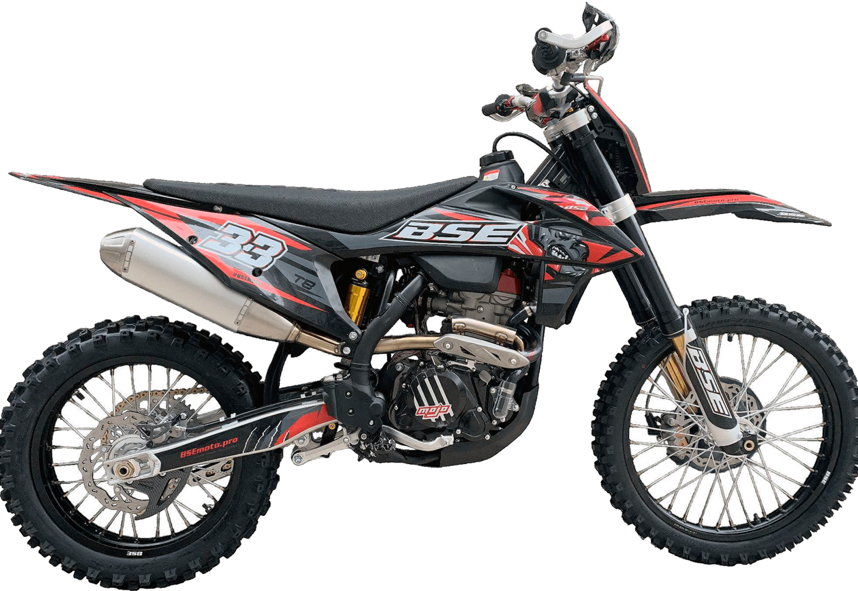 Новинка Т8 из абсолютно новой линейки 2023 года – T серии!Наша гордость – новый мотор TYAN TYX250-SR. Данный мотор является эксклюзивным для бренда BSE на российском рынке. Официально только у BSE Russia есть разрешение на установку мотора TYAN TYX250-SR на свою продукцию.TYAN Motor -профессиональный производитель двигателей и мотоциклов из индустриальной провинции на юго-востоке Китая. TYAN Motor специализируется на разработке, производстве, продаже и сервисе высококачественных моторов и мотоциклов вот уже 11 лет. Капитал компании составляет 1,5 млн $. Территория завода – 29 гектаров, есть современное оборудование и автоматизированные транспортные линии. Собственный первоклассный отдел разработок (R&D center) защитил более 200 патентов. Продукция завода крайне распространена не только в Китае, но и во всем мире. Ежегодно выпускается 1.5 миллионов двигателей и 300 000 мотоциклов. Все нацелено на качество продукции. Цель компании: выпускать самые лучшие двигатели на рынке. Слоган компании: "Еще больше мощности при лучшем качестве".Новый двигатель TYAN TYX250-SR – один из самых технологичных, современных и мощных из доступных на китайском рынке. Рабочий объём -250сс, 4-х тактный, 2 распредвала DOHC, 4-клапанная ГБЦ, водяное охлаждение, балансирный вал. Система питания – проверенный карбюратор Nibbi Racing 34 Black. Все это позволило снять внушительные 29 л.с. при 9000 об. в мин. и 24 Нм при 7500 об. в мин. Коробка передач – механическая 6 ступенчатая, запуск – только электростартером. Мотор сделан максимально легким, прочным и эффективным, с минимальными вибрациями для комфортного передвижения.Ещё одна особенность модели Т8 – абсолютно новая рама, которая полностью соответствует всем стандартам самого известного австрийского бренда мотоциклов для кросса и эндуро – KTM. Единая геометрия, эргономика, пропорции и углы вылета вилки. Высококачественная сталь, малый вес и большой запас прочности, идеальная развесовка. Мотоцикл оснащен легким алюминиевым подрамником, системой прогрессии и пластиковой защитой мотора. Установлен новый тип пластика - прочный, легкий и современный. Короткая колесная база в 1460 мм добавляет отменную маневренность.T8 оборудован фирменной заводской спортивной подвеской BSE Mojo Racing. Подвеска с большими ходами имеет полный диапазон регулировок и помогает отрабатывать даже самые жесткие приземления, с лёгкостью "глотая" все неровности. Подвеску легко настроить под любой рельеф, любую трассу и стиль езды. Вы ощутите результат, когда будете сокращать секунды круг за кругом! Особое внимание было направлено на снижение веса всей подвески.Разработка подвески BSE Mojo Racing производилась опытными инженерами-подвесочниками завода, а настройка - под чутким контролем заводской спортивной китайской командой BOSUER. Спереди установлена полностью регулируемая вилка «перевертыш» BSE Mojo Racing c перьями диаметром 53/58.5 мм, 930 мм. Сзади установлен полностью настраиваемый моноамортизатор BSE Mojo Racing 480 мм.На T8 установлен топливный бак на 8 л, мощная тормозная гидравлическая система с дисками диаметром 240 мм, звезды 13t – 49t, «зубастые» покрышки Carrystone 80/100-21 спереди и 110/90-18 сзади. Мотоцикл оснащается полностью светодиодной фарой головного света, грипсами и ручкой газа Nibbi Racing, цепкой шкуркой сиденья и защитой переднего тормозного диска.Легкий (сухая масса 114 кг), прекрасно сбалансированный, мощный мотор. Отточенн