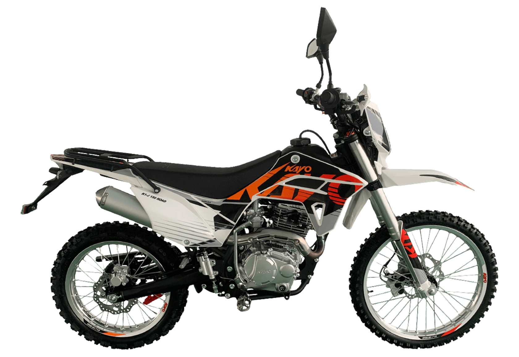 KAYO K1-J 150 ROAD (CB150) 19/16 (2025 г.) ПТС – мотоцикл, который создан для тех, кто готов покорять внедорожные трассы.4-тактный мотор с воздушным охлаждением и одним верхним распределительным валом (SOHC) сочетает надёжность и отличную динамику. Объём двигателя составляет 144,6 см³. Он обеспечивает мощность в 12 л.с. при 8500 об/мин и максимальный крутящий момент 10 Н·м при 6500 об/мин. Степень сжатия 9,2:1, диаметр и ход поршня – 65,5 x 49,5 мм. Всё это работает в паре с карбюратором PE24, который гарантирует стабильную работу двигателя.Система запуска универсальная: электростартер и кикстартер, чтобы вы всегда были готовы к поездке. Тип зажигания CDI.Коробка передач механическая с 5 ступенями. Привод цепной. Топливный бак на 6 литров.Мотоцикл оснащён нерегулируемой передней 735 мм вилкой и задним 360 мм амортизатором. Задний маятник и прогрессия стальные. Траверсы выполнены из литого алюминия.Колёса размером 19 дюймов спереди и 16 дюймов сзади. Алюминиевые обода, ступицы и буксаторы. Для уверенной остановки предусмотрены гидравлические дисковые тормоза спереди и сзади.Габариты 1850×760×1060 мм и сухая масса всего 95 кг. Колёсная база 1250 мм. Дорожный просвет 250 мм, высота по седлу 790 мм.На KAYO K1-J 150 ROAD можно выезжать на дороги общего пользования благодаря наличию ПТС, цифровой приборной панели, звукового сигнала, зеркал заднего вида и необходимого набора светотехники.Имеются стальные подножки для поездок с пассажиром и задняя багажная платформа. Пластиковая защита рычагов.